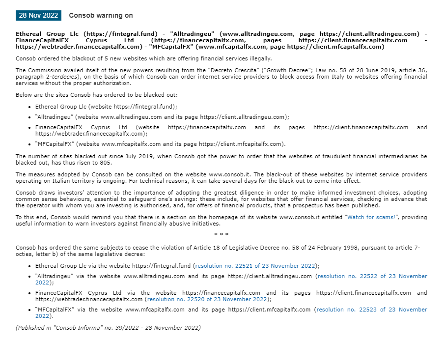 Consob warning on Ethereal Group Llc (https://fintegral.fund) - "Alltradingeu" (www.alltradingeu.com, page https://client.alltradingeu.com) - FinanceCapitalFX Cyprus Ltd (https://financecapitalfx.com, pages https://client.financecapitalfx.com - https://webtrader.financecapitalfx.com) - "MFCapitalFX" (www.mfcapitalfx.com, page https://client.mfcapitalfx.com)