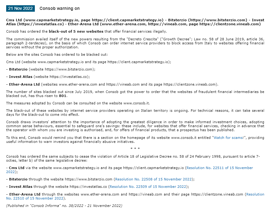Consob warning on Cms Ltd (www.capmarketstrategy.io, page https://client.capmarketstrategy.io) - Bitsterzio (https://www.bitsterzio.com) - Invest Atlas (https://investatlas.co) - Ether-Arena Ltd (www.ether-arena.com, https://vineab.com, page https://clientzone.vineab.com)