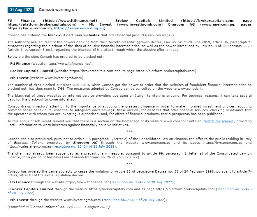Consob warning on Fti Finance (https://www.ftifinance.net) - Broker Capitals Limited (https://brokercapitals.com, page https://platform.brokercapitals.com) - Mb Invest (www.investingmb.com) Enercom AG (www.enercom.ag, pages https://kyc.enercom.ag, https://sales.enercomg.ag)