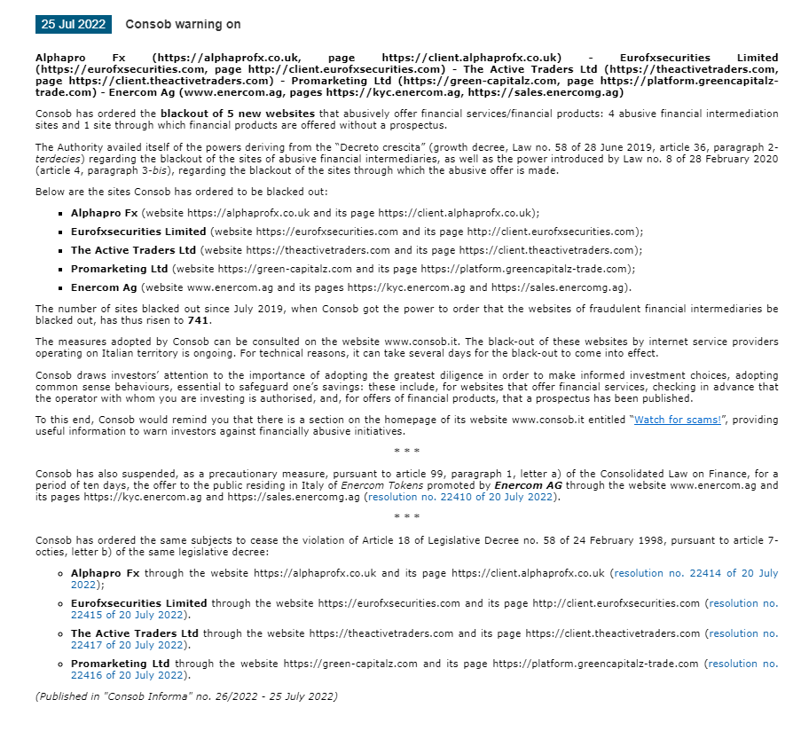 Consob warning on Alphapro Fx (https://alphaprofx.co.uk, page https://client.alphaprofx.co.uk) - Eurofxsecurities Limited (https://eurofxsecurities.com, page http://client.eurofxsecurities.com) - The Active Traders Ltd (https://theactivetraders.com, page https://client.theactivetraders.com) - Promarketing Ltd (https://green-capitalz.com, page https://platform.greencapitalz-trade.com) - Enercom Ag (www.enercom.ag, pages https://kyc.enercom.ag, https://sales.enercomg.ag)