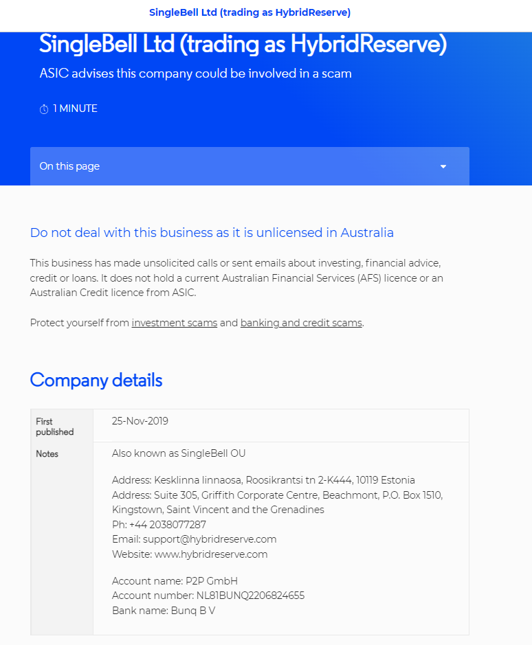 investor alert list SingleBell Ltd (trading as HybridReserve) ASIC advises this company could be involved in a scam