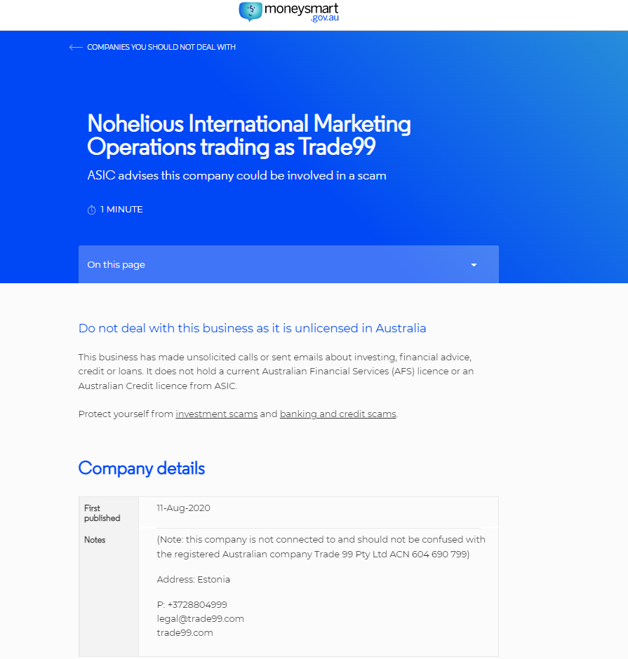 Nohelious International Marketing Operations trading as Trade99 ASIC advises this company could be involved in a scam PAGE READING TIME:1 MINUTE On this page Do not deal with this business as it is unlicensed in Australia This business has made unsolicited calls or sent emails about investing, financial advice, credit or loans. It does not hold a current Australian Financial Services (AFS) licence or an Australian Credit licence from ASIC. Protect yourself from investment scams and banking and credit scams. Company details First published 11-Aug-2020 Notes (Note: this company is not connected to and should not be confused with the registered Australian company Trade 99 Pty Ltd ACN 604 690 799) Address: Estonia P: +3728804999 legal@trade99.com trade99.com