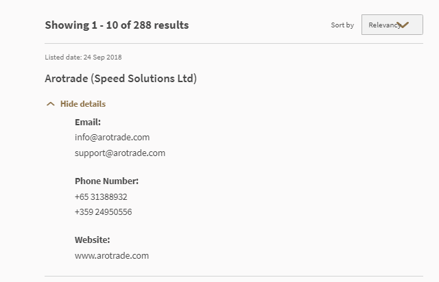 "Investor Alert List The Investor Alert List provides a list of persons who, based on information available to MAS, i) may be or may have been wrongly perceived as being licensed or in any other way authorised or regulated by MAS; ii) have made an offer of units in a business trust or collective investment scheme which may be or may have been wrongly perceived as being authorised, recognised or registered by MAS; iii) have made an offer of investment which may be or may have been wrongly perceived as being made in or accompanied by a document lodged or registered with MAS. This list is not exhaustive and is based on what was known to MAS at the time of publication." Listed date: 24 Sep 2018 Arotrade (Speed Solutions Ltd) Hide details Email: info@arotrade.com support@arotrade.com Phone Number: +65 31388932 +359 24950556 Website: www.arotrade.com