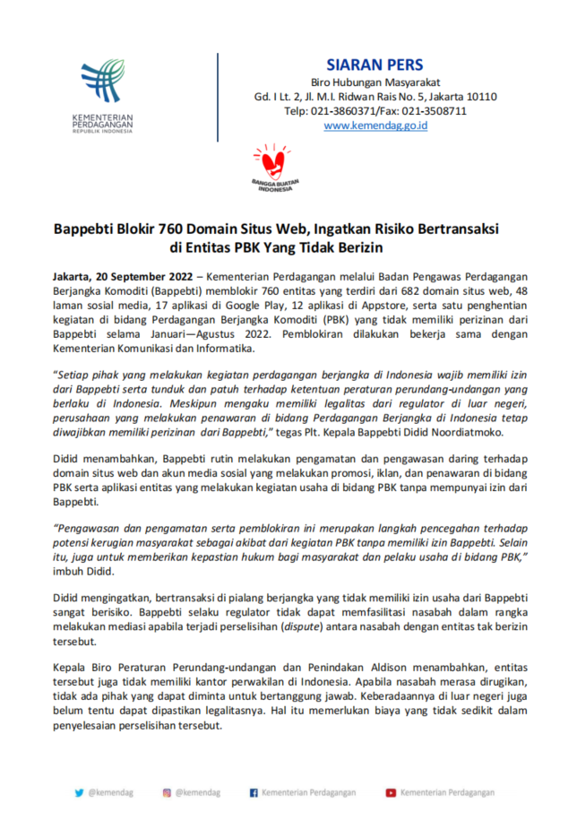 "jakarta, 20 september 2022 – the ministry of trade through the commodity futures trading supervisory agency (bappebti) blocked 760 entities consisting of 682 website domains, 48 social media pages, 17 applications on google play, 12 applications on the appstore, and one stop of activity on in the field of commodity futures trading (Pbk) which did not have a permit from Bappebti during January-August 2022. The blocking was carried out in collaboration with the Ministry of Communication and Informatics. "Any party carrying out futures trading activities in Indonesia must IB has a permit from Bappebti and is subject to and obedient to the provisions of the laws and regulations in force in Indonesia. even though they claim to have legality from overseas regulators, companies that make offers in the field of futures trading in Indonesia are still required to pay a fee IB do you have a permit from Bappebti," said Plt. Head of Bappebti Didid Noordiatmoko. didid added, Bappebti routinely conducts online observation and supervision of website domains and social media accounts that carry out promotions, advertisements, and offers in the Pbk sector as well as entity applications that carry out business activities in the Pbk sector without having permission from Bappebti. "supervision and observation as well as blocking is a preventive measure against potential losses to the community as an ak IB at from pbk activities without having a permit from Bappebti. Apart from that, it is also to provide legal certainty for the community and business actors in the Pbk sector," Didid added. didid reminded, transacting at a futures broker who does not have a business license from Bappebti is very risky. Bappebti as the regulator cannot facilitate customers in conducting mediation in the event of a dispute between the customer and the unlicensed entity. Head of the Bureau of Laws and Enforcement, Aldison added, the entity also does not have a representative office in Indonesia. if the customer feels aggrieved, no party can be held responsible. its existence abroad is also not certain its legality can be ascertained. it requires no small cost in resolving the dispute. "Apart from that, CoFTRA cannot ensure the integrity of the management and financial integrity of the entity. the security of funds deposited as transaction capital cannot be guaranteed because they do not use a separate account (segregated account) approved by CoFTRA," explained Aldison. people who are going to transact in the Pbk sector are advised to first study the background of the company, procedures for transactions and dispute resolution, commodity futures contracts offered, the legality of futures brokers, document agreements regarding risks faced, and not to be easily tempted by large profits in a short time and out of bounds. “Before deciding to make a transaction, first know the profile and legality of business actors in the Pbk sector. this information can be accessed easily via the link http://ceklegalitas.bappebti.go.id," concluded Aldison."