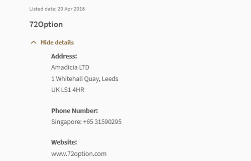 "Investor Alert List The Investor Alert List provides a list of persons who, based on information available to MAS, i) may be or may have been wrongly perceived as being licensed or in any other way authorised or regulated by MAS; ii) have made an offer of units in a business trust or collective investment scheme which may be or may have been wrongly perceived as being authorised, recognised or registered by MAS; iii) have made an offer of investment which may be or may have been wrongly perceived as being made in or accompanied by a document lodged or registered with MAS. This list is not exhaustive and is based on what was known to MAS at the time of publication." Listed date: 20 Apr 2018 72Option Hide details Address: Amadicia LTD 1 Whitehall Quay, Leeds UK LS1 4HR Phone Number: Singapore: +65 31590295 Website: www.72option.com