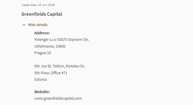 "Investor Alert List The Investor Alert List provides a list of persons who, based on information available to MAS, i) may be or may have been wrongly perceived as being licensed or in any other way authorised or regulated by MAS; ii) have made an offer of units in a business trust or collective investment scheme which may be or may have been wrongly perceived as being authorised, recognised or registered by MAS; iii) have made an offer of investment which may be or may have been wrongly perceived as being made in or accompanied by a document lodged or registered with MAS. This list is not exhaustive and is based on what was known to MAS at the time of publication." Listed date: 25 Jun 2018 Greenfields Capital Hide details Address: Yolenger s.r.o 500/9 Dopravni Str. Ulhzhneves, 10400 Prague 10 9th Joe St. Tallinn, Kinteka OU 5th Floor, Office #71 Estonia Website: www.greenfieldscapital.com