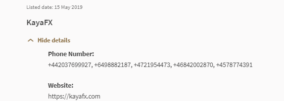 "Investor Alert List The Investor Alert List provides a list of persons who, based on information available to MAS, i) may be or may have been wrongly perceived as being licensed or in any other way authorised or regulated by MAS; ii) have made an offer of units in a business trust or collective investment scheme which may be or may have been wrongly perceived as being authorised, recognised or registered by MAS; iii) have made an offer of investment which may be or may have been wrongly perceived as being made in or accompanied by a document lodged or registered with MAS. This list is not exhaustive and is based on what was known to MAS at the time of publication." Listed date: 15 May 2019 KayaFX Hide details Phone Number: +442037699927, +6498882187, +4721954473, +46842002870, +4578774391 Website: https://kayafx.com
