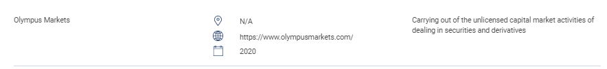 "This section contains the list of unauthorised websites, investment products, companies and individuals. This list includes: Persons carrying on or hold himself out as carrying on the following regulated activities without a licence from the SC: Dealing in securities; Dealing in derivatives;Fund management; Advising on corporate finance; Investment advice; Financial planning; and Dealing in private retirement schemes. Persons operating a recognised market without authorisation. Persons issuing or offering securities without approval, authorisation or recognition. Persons misusing SC’s logo and misrepresenting the SC. " Olympus Markets N/A https://www.olympusmarkets.com/ 2020 Carrying out of the unlicensed capital market activities of dealing in securities and derivatives
