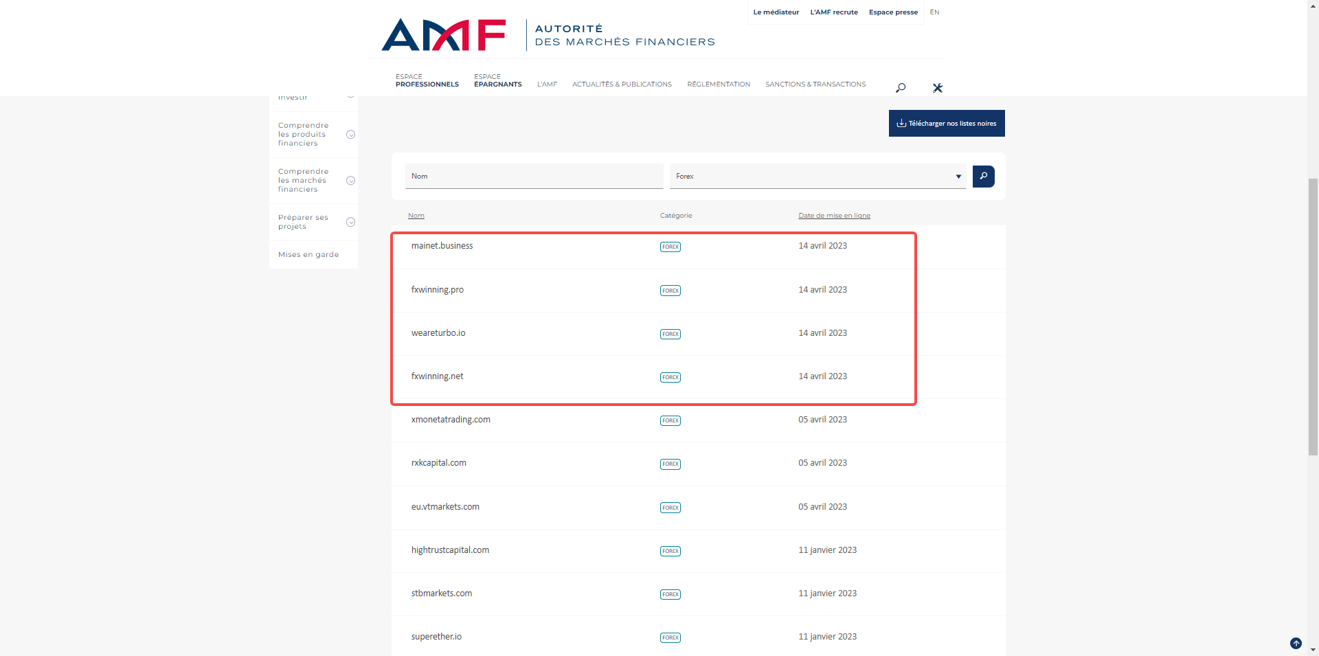 This is a list of the Autorité des Marchés Financiers (AMF) blacklisted companies or websites, warnings and/or usurpations of regulated companies.