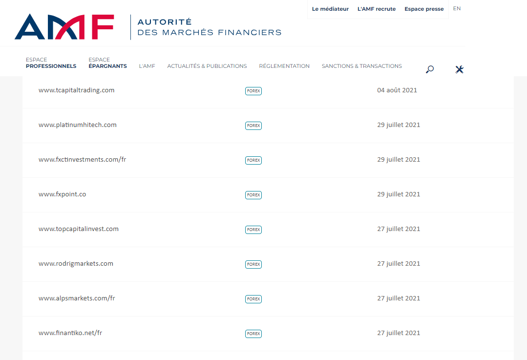 This is a list of the Autorité des Marchés Financiers (AMF) blacklisted companies or websites, warnings and/or usurpations of regulated companies.