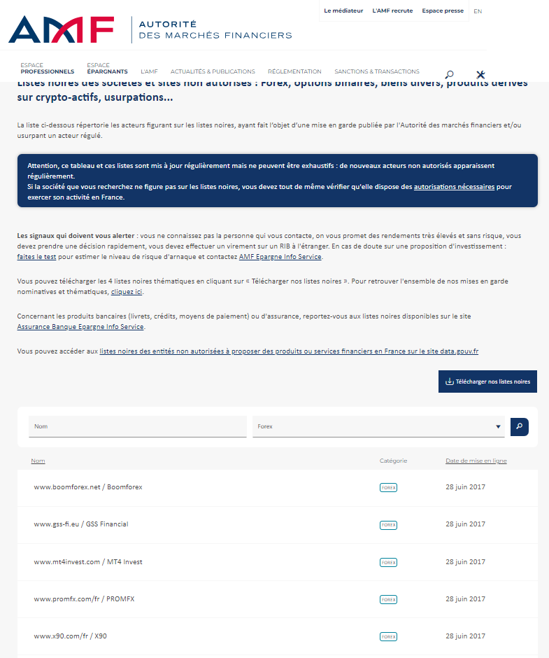 This is a list of the Autorité des Marchés Financiers (AMF) blacklisted companies or websites, warnings and/or usurpations of regulated companies.
