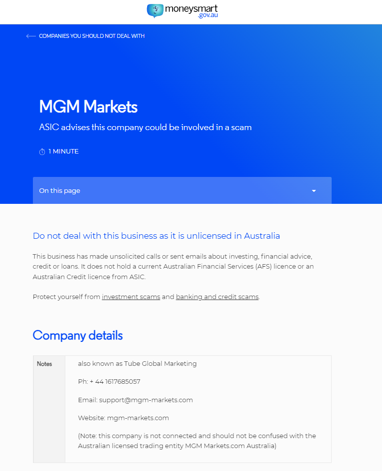 MGM Markets ASIC advises this company could be involved in a scam PAGE READING TIME:1 MINUTE On this page Do not deal with this business as it is unlicensed in Australia This business has made unsolicited calls or sent emails about investing, financial advice, credit or loans. It does not hold a current Australian Financial Services (AFS) licence or an Australian Credit licence from ASIC. Protect yourself from investment scams and banking and credit scams. Company details Notes also known as Tube Global Marketing Ph: + 44 1617685057 Email: support@mgm-markets.com Website: mgm-markets.com (Note: this company is not connected and should not be confused with the Australian licensed trading entity MGM Markets.com Australia)