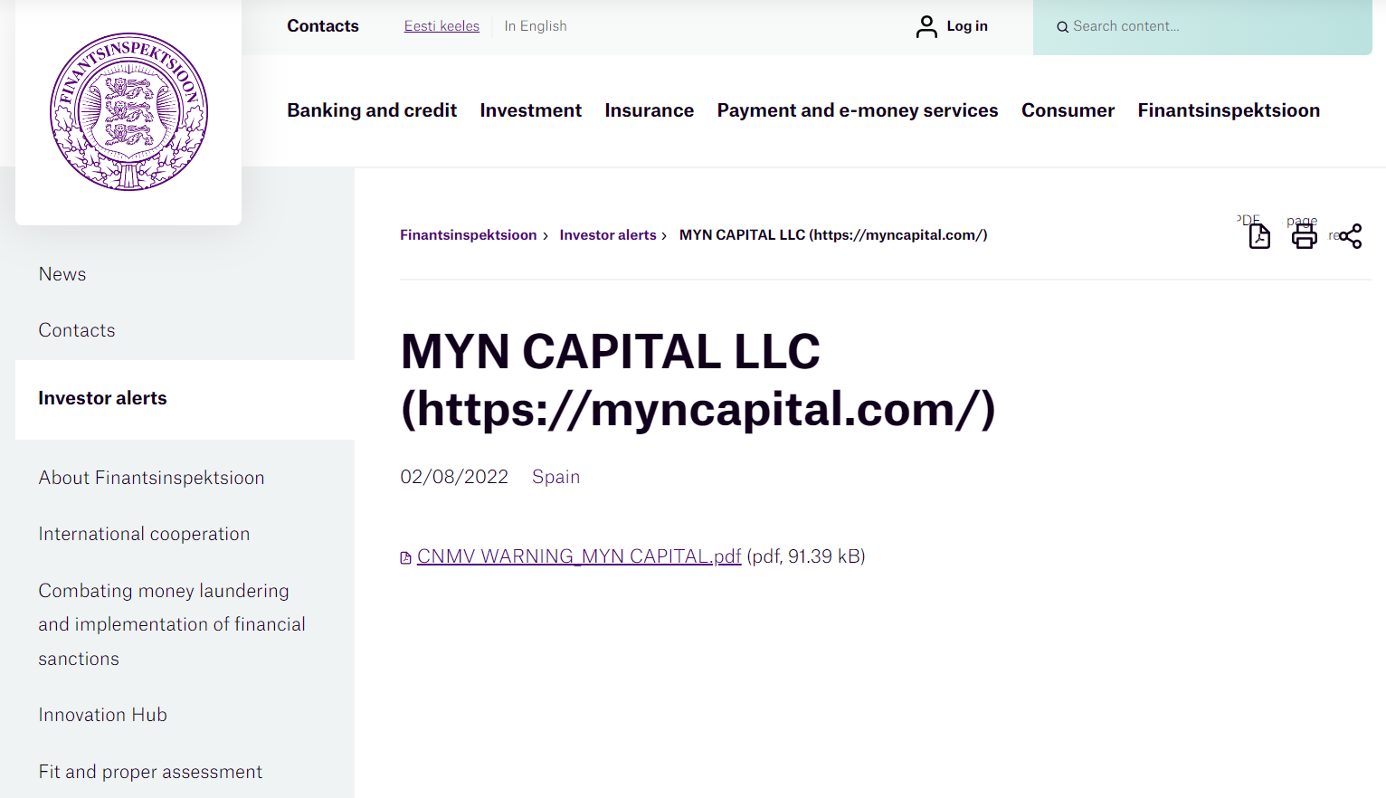 • Reason for punishment MYN CAPITAL LLC is not authorised to provide the investment services.
