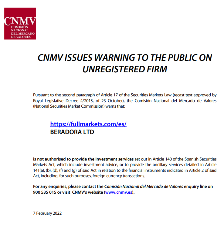 Pursuant to the second paragraph of Article 17 of the Securities Markets Law (recast text approved by Royal Legislative Decree 4/2015, of 23 October), the Comisión Nacional del Mercado de Valores (National Securities Market Commission) warns that:BERADORA LTD is not authorised to provide the investment services set out in Article 140 of the Spanish Securities Markets Act, which include investment advice, or to provide the ancillary services detailed in Article 141(a), (b), (d), (f) and (g) of said Act in relation to the financial instruments indicated in Article 2 of said Act, including, for such purposes, foreign currency transactions.