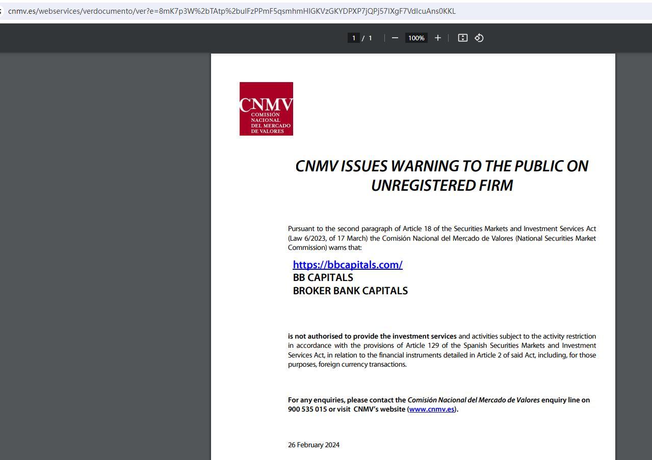 CNMV ISSUES WARNING TO THE PUBLIC ON UNREGISTERED FIRM Pursuant to the second paragraph of Article 18 of the Securities Markets and Investment Services Act (Law 6/2023, of 17 March) the Comisión Nacional del Mercado de Valores (National Securities Market Commission) warns that: https://bbcapitals.com/ BB CAPITALS BROKER BANK CAPITALS is not authorised to provide the investment services and activities subject to the activity restriction in accordance with the provisions of Article 129 of the Spanish Securities Markets and Investment Services Act, in relation to the financial instruments detailed in Article 2 of said Act, including, for those purposes, foreign currency transactions. For any enquiries, please contact the Comisión Nacional del Mercado de Valores enquiry line on 900 535 015 or visit CNMV’s website (www.cnmv.es). 26 February 2024