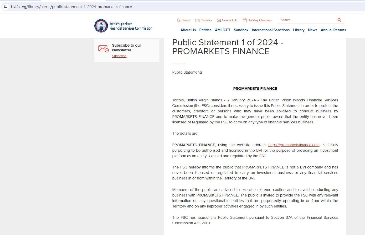 Public Statement 1 of 2024 - PROMARKETS FINANCE Public Statements PROMARKETS FINANCE Tortola, British Virgin Islands - 2 January 2024 - The British Virgin Islands Financial Services Commission (the FSC) considers it necessary to issue this Public Statement in order to protect the customers, creditors or persons who may have been solicited to conduct business by PROMARKETS FINANCE and to make the general public aware that the entity has never been licensed or regulated by the FSC to carry on any type of financial services business. The details are: PROMARKETS FINANCE, using the website address https://promarketsfinance.com, is falsely purporting to be authorised and licensed in the BVI for the purpose of providing an investment platform as an entity licensed and regulated by the FSC. The FSC hereby informs the public that PROMARKETS FINANCE is not a BVI company and has never been licensed or regulated to carry on investment business or any financial services business in or from within the Territory of the BVI. Members of the public are advised to exercise extreme caution and to avoid conducting any business with PROMARKETS FINANCE. The public is invited to provide the FSC with any relevant information on any questionable entities that are purportedly operating in or from within the Territory and on any improper activities engaged in by such entities. The FSC has issued this Public Statement pursuant to Section 37A of the Financial Services Commission Act, 2001.
