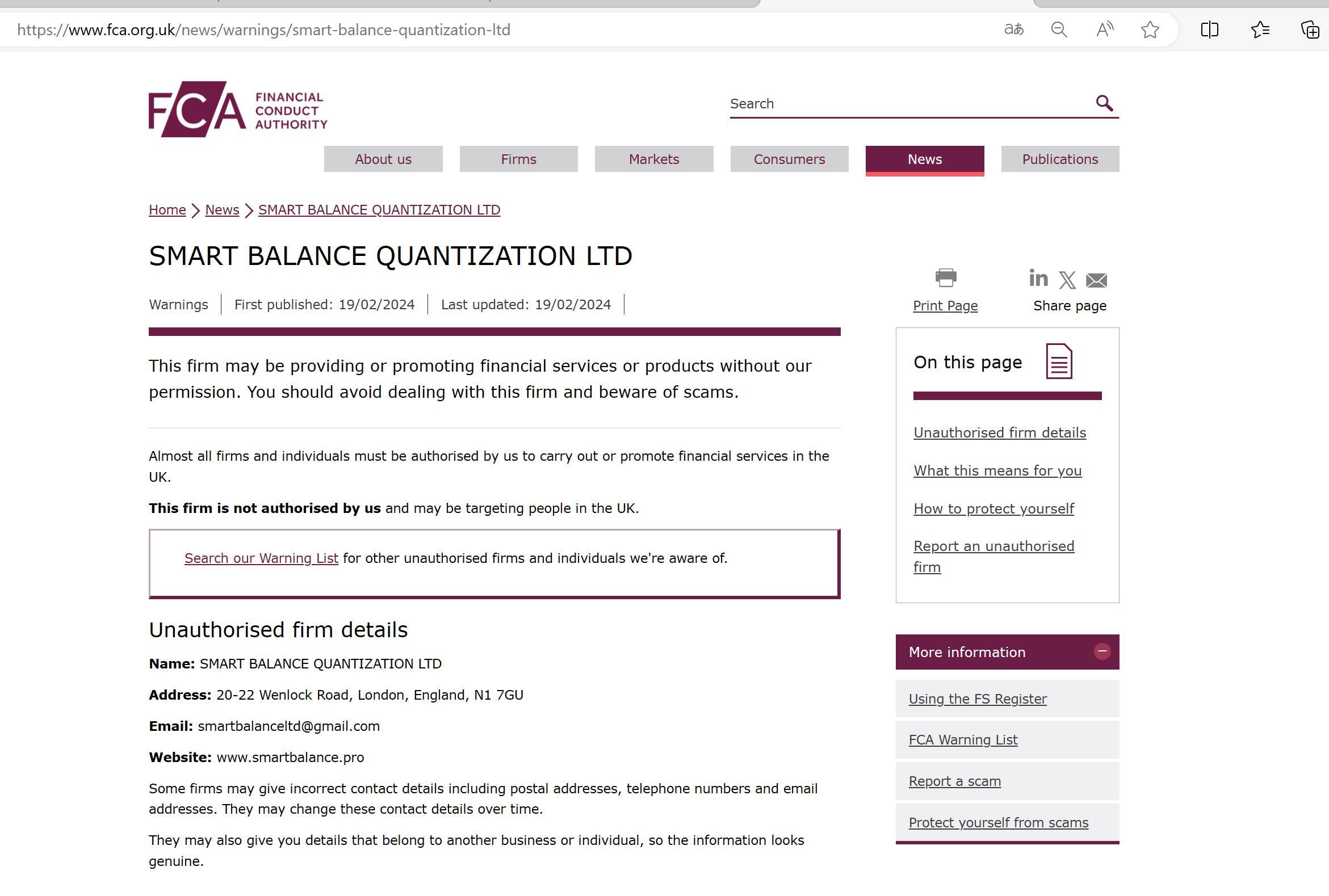 FCA Warning List of unauthorised firms SMART BALANCE QUANTIZATION LTD