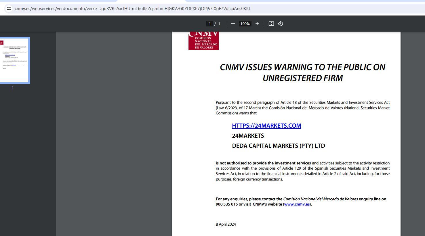 CNMV ISSUES WARNING TO THE PUBLIC ON UNREGISTERED FIRM Pursuant to the second paragraph of Article 18 of the Securities Markets and Investment Services Act (Law 6/2023, of 17 March) the Comisión Nacional del Mercado de Valores (National Securities Market Commission) warns that: HTTPS://24MARKETS.COM 24MARKETS DEDA CAPITAL MARKETS (PTY) LTD is not authorised to provide the investment services and activities subject to the activity restriction in accordance with the provisions of Article 129 of the Spanish Securities Markets and Investment Services Act, in relation to the financial instruments detailed in Article 2 of said Act, including, for those purposes, foreign currency transactions. For any enquiries, please contact the Comisión Nacional del Mercado de Valores enquiry line on 900 535 015 or visit CNMV’s website (www.cnmv.es). 8 April 2024