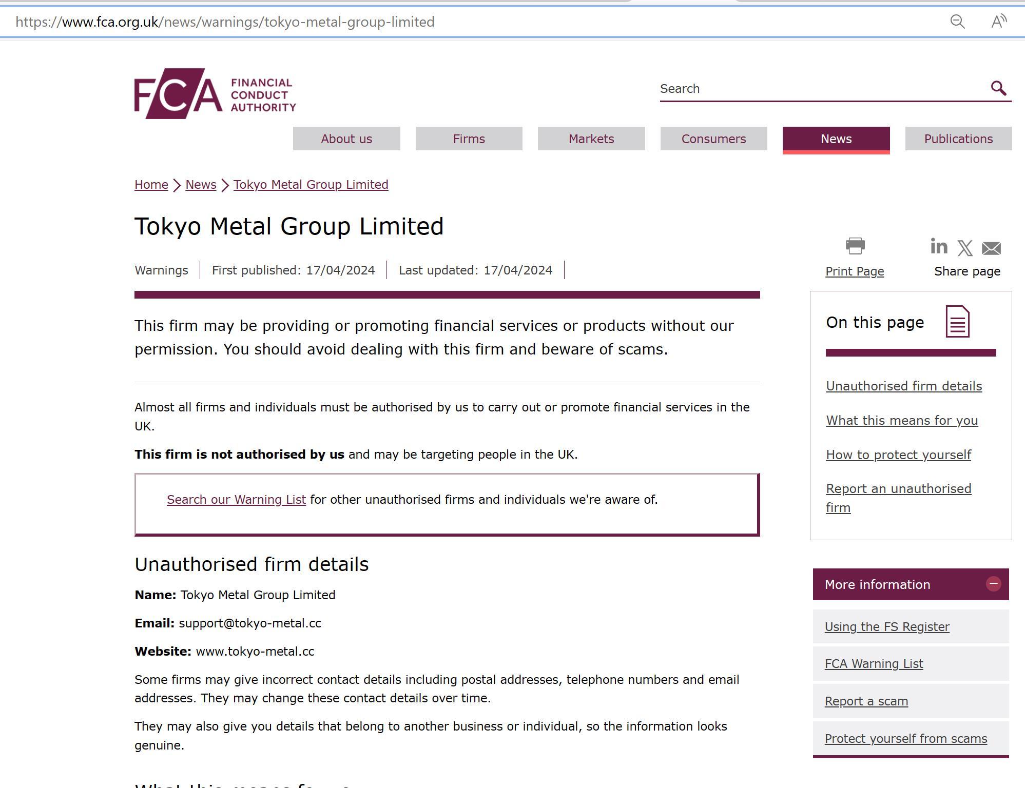 First published: 17/04/2024 Last updated: 17/04/2024 This firm may be providing or promoting financial services or products without our permission. You should avoid dealing with this firm and beware of scams. Almost all firms and individuals must be authorised by us to carry out or promote financial services in the UK. This firm is not authorised by us and may be targeting people in the UK. Search our Warning List for other unauthorised firms and individuals we're aware of. Unauthorised firm details Name: Tokyo Metal Group Limited Email: support@tokyo-metal.cc Website: www.tokyo-metal.cc Some firms may give incorrect contact details including postal addresses, telephone numbers and email addresses. They may change these contact details over time. They may also give you details that belong to another business or individual, so the information looks genuine.