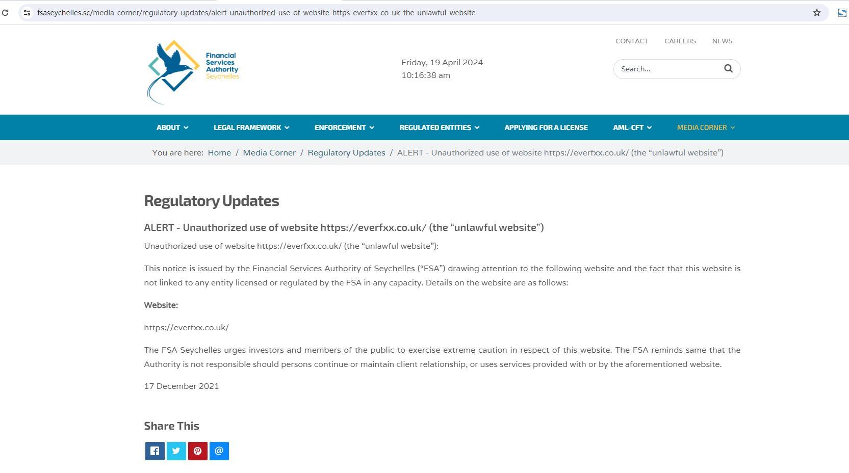 Regulatory Updates ALERT - Unauthorized use of website https://everfxx.co.uk/ (the “unlawful website”) Unauthorized use of website https://everfxx.co.uk/ (the “unlawful website”): This notice is issued by the Financial Services Authority of Seychelles (“FSA”) drawing attention to the following website and the fact that this website is not linked to any entity licensed or regulated by the FSA in any capacity. Details on the website are as follows: Website: https://everfxx.co.uk/ The FSA Seychelles urges investors and members of the public to exercise extreme caution in respect of this website. The FSA reminds same that the Authority is not responsible should persons continue or maintain client relationship, or uses services provided with or by the aforementioned website. 17 December 2021