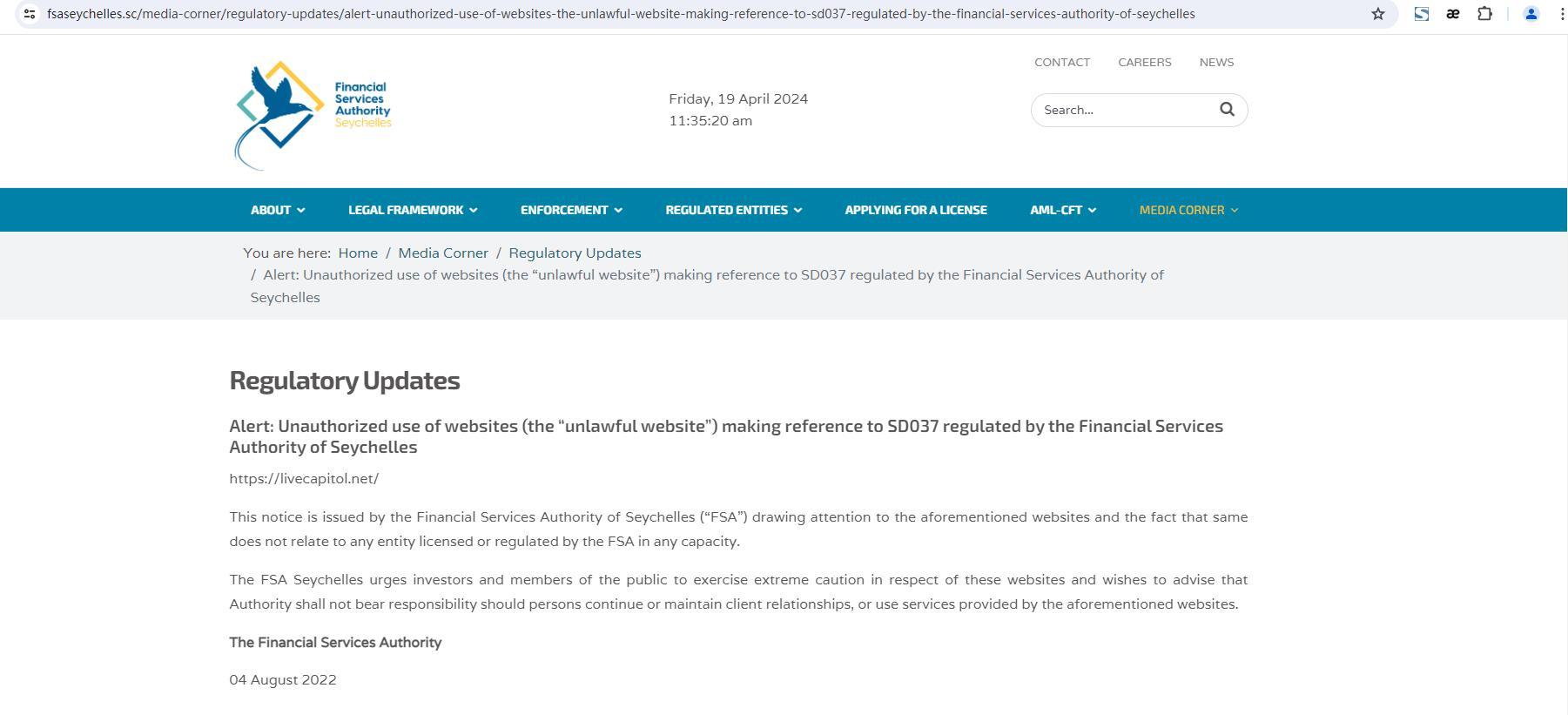 Regulatory Updates Alert: Unauthorized use of websites (the “unlawful website”) making reference to SD037 regulated by the Financial Services Authority of Seychelles https://livecapitol.net/ This notice is issued by the Financial Services Authority of Seychelles (“FSA”) drawing attention to the aforementioned websites and the fact that same does not relate to any entity licensed or regulated by the FSA in any capacity. The FSA Seychelles urges investors and members of the public to exercise extreme caution in respect of these websites and wishes to advise that Authority shall not bear responsibility should persons continue or maintain client relationships, or use services provided by the aforementioned websites. The Financial Services Authority 04 August 2022