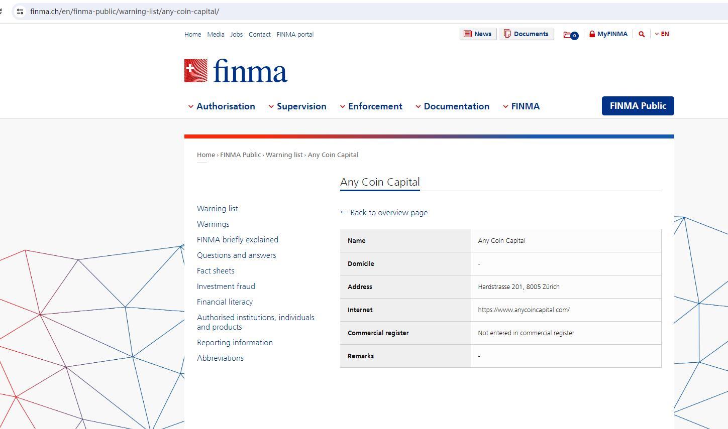 Warning list of unauthorised companies and individuals Warning List -https://www.anycoincapital.com