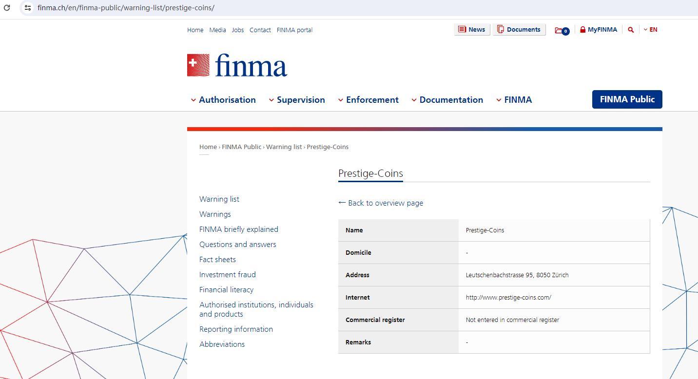 Warning list of unauthorised companies and individuals Warning List -http://www.prestige-coins.com/