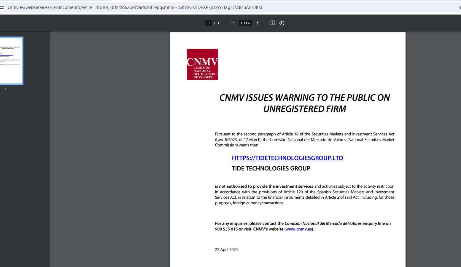 CNMV ISSUES WARNING TO THE PUBLIC ON UNREGISTERED FIRM Pursuant to the second paragraph of Article 18 of the Securities Markets and Investment Services Act (Law 6/2023, of 17 March) the Comisión Nacional del Mercado de Valores (National Securities Market Commission) warns that: HTTPS://TIDETECHNOLOGIESGROUP.LTD TIDE TECHNOLOGIES GROUP is not authorised to provide the investment services and activities subject to the activity restriction in accordance with the provisions of Article 129 of the Spanish Securities Markets and Investment Services Act, in relation to the financial instruments detailed in Article 2 of said Act, including, for those purposes, foreign currency transactions. For any enquiries, please contact the Comisión Nacional del Mercado de Valores enquiry line on 900 535 015 or visit CNMV’s website (www.cnmv.es). 22 April 2024