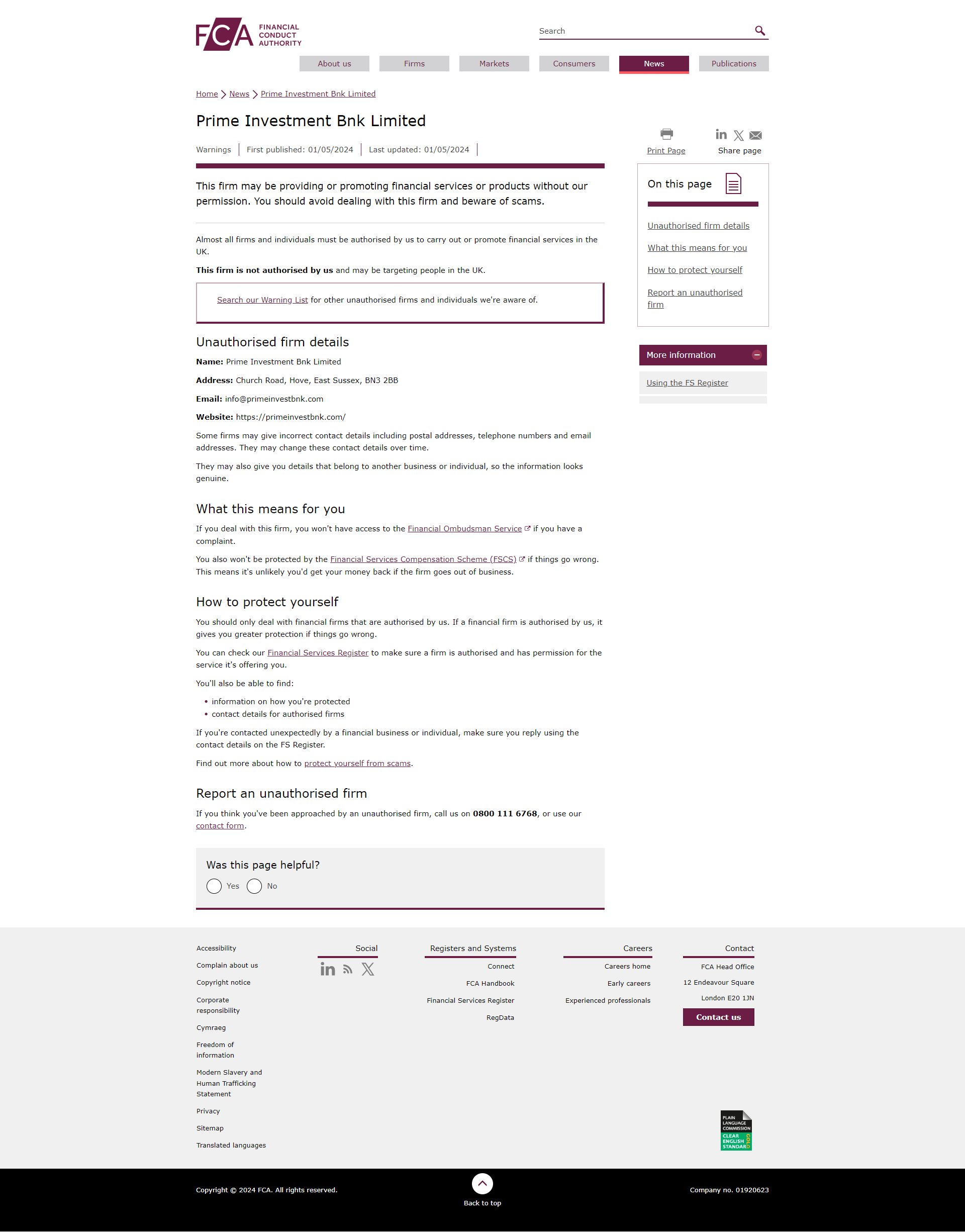 FCA Warning List of unauthorised firms Prime Investment Bnk Limited