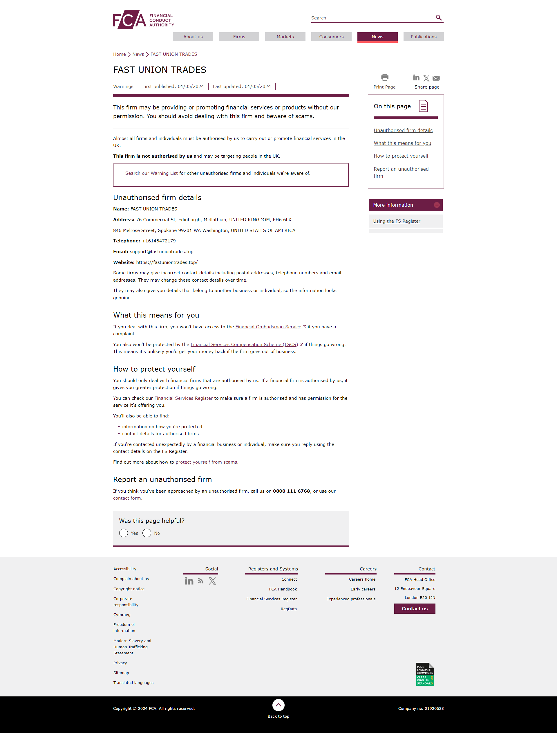 First published: 01/05/2024 Last updated: 01/05/2024 This firm may be providing or promoting financial services or products without our permission. You should avoid dealing with this firm and beware of scams. Almost all firms and individuals must be authorised by us to carry out or promote financial services in the UK. This firm is not authorised by us and may be targeting people in the UK. Search our Warning List for other unauthorised firms and individuals we're aware of. Unauthorised firm details Name: FAST UNION TRADES Address: 76 Commercial St, Edinburgh, Midlothian, UNITED KINGDOM, EH6 6LX 846 Melrose Street, Spokane 99201 WA Washington, UNITED STATES OF AMERICA Telephone: +16145472179 Email: support@fastuniontrades.top Website: https://fastuniontrades.top/ Some firms may give incorrect contact details including postal addresses, telephone numbers and email addresses. They may change these contact details over time. They may also give you details that belong to another business or individual, so the information looks genuine.