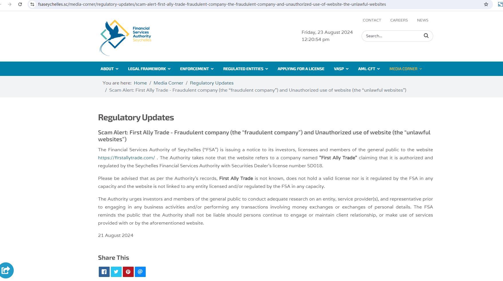 The Financial Services Authority of Seychelles (“FSA”) is issuing a notice to its investors, licensees and members of the general public to the website https://firstallytrade.com/ . The Authority takes note that the website refers to a company named "First Ally Trade" claiming that it is authorized and regulated by the Seychelles Financial Services Authority with Securities Dealer's license number SD018.