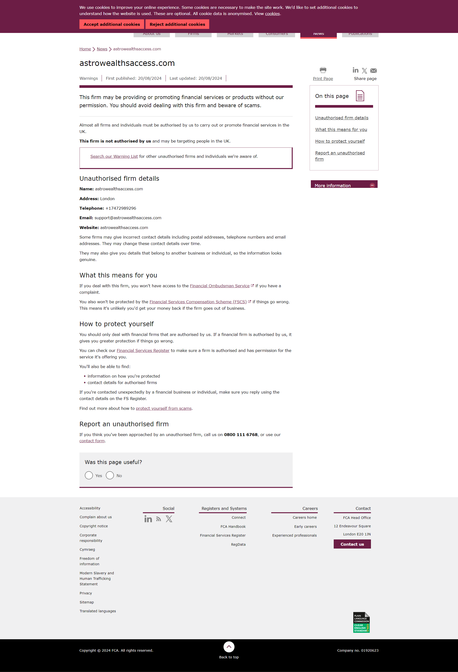 First published: 20/08/2024 Last updated: 20/08/2024 This firm may be providing or promoting financial services or products without our permission. You should avoid dealing with this firm and beware of scams. Almost all firms and individuals must be authorised by us to carry out or promote financial services in the UK. This firm is not authorised by us and may be targeting people in the UK. Search our Warning List for other unauthorised firms and individuals we're aware of. Unauthorised firm details Name: astrowealthsaccess.com Address: London Telephone: +17472989296 Email: support@astrowealthsaccess.com Website: astrowealthsaccess.com Some firms may give incorrect contact details including postal addresses, telephone numbers and email addresses. They may change these contact details over time. They may also give you details that belong to another business or individual, so the information looks genuine.