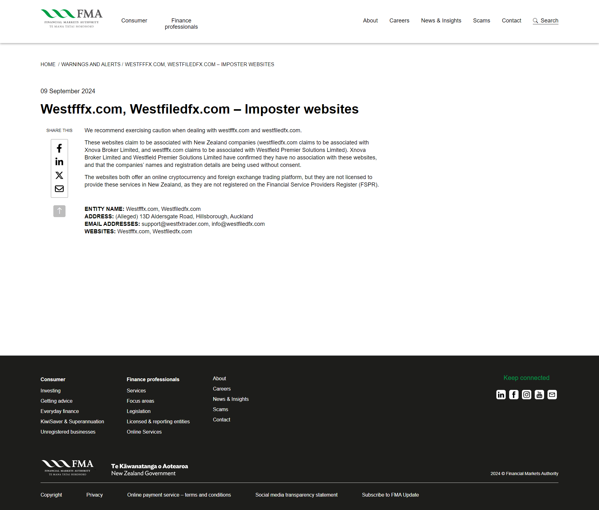 09 September 2024 Westfffx.com, Westfiledfx.com – Imposter websites SHARE THIS We recommend exercising caution when dealing with westfffx.com and westfiledfx.com. These websites claim to be associated with New Zealand companies (westfiledfx.com claims to be associated with Xnova Broker Limited, and westfffx.com claims to be associated with Westfield Premier Solutions Limited). Xnova Broker Limited and Westfield Premier Solutions Limited have confirmed they have no association with these websites, and that the companies’ names and registration details are being used without consent. The websites both offer an online cryptocurrency and foreign exchange trading platform, but they are not licensed to provide these services in New Zealand, as they are not registered on the Financial Service Providers Register (FSPR). ENTITY NAME: Westfffx.com, Westfiledfx.com ADDRESS: (Alleged) 13D Aldersgate Road, Hillsborough, Auckland EMAIL ADDRESSES: support@westfxtrader.com, info@westfiledfx.com WEBSITES: Westfffx.com, Westfiledfx.com