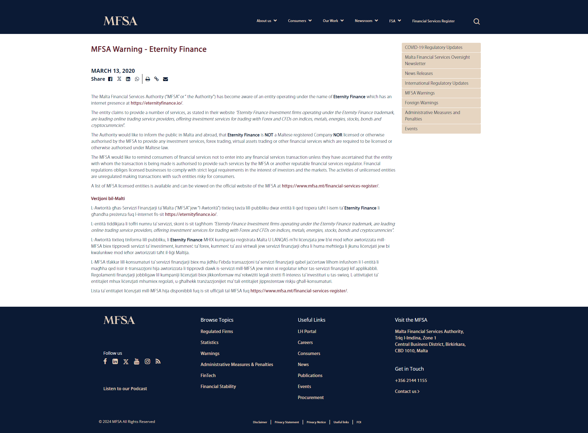 MFSA Warning - Eternity Finance