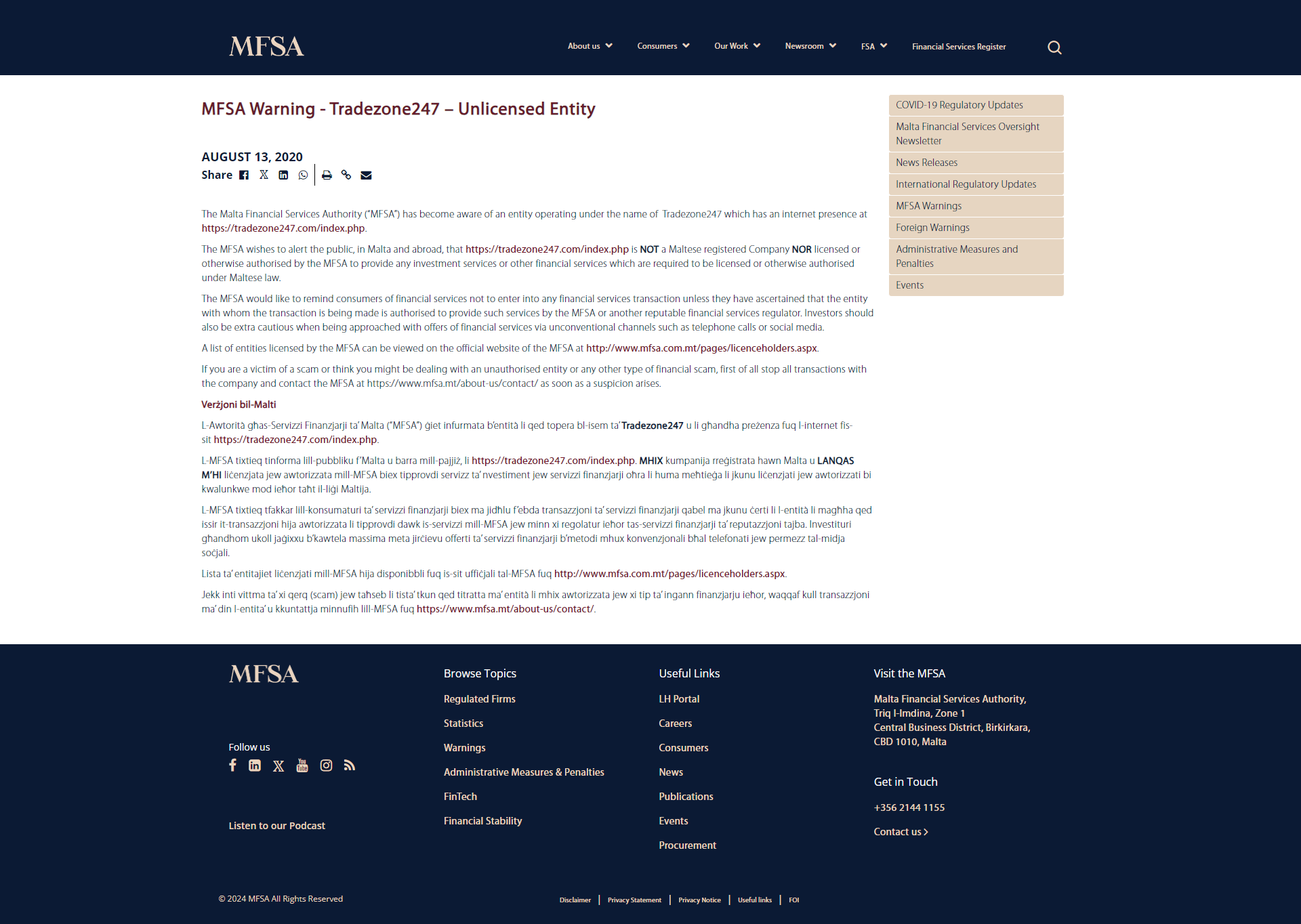 The Malta Financial Services Authority (“MFSA”) has become aware of an entity operating under the name of Tradezone247 which has an internet presence at https://tradezone247.com/index.php.