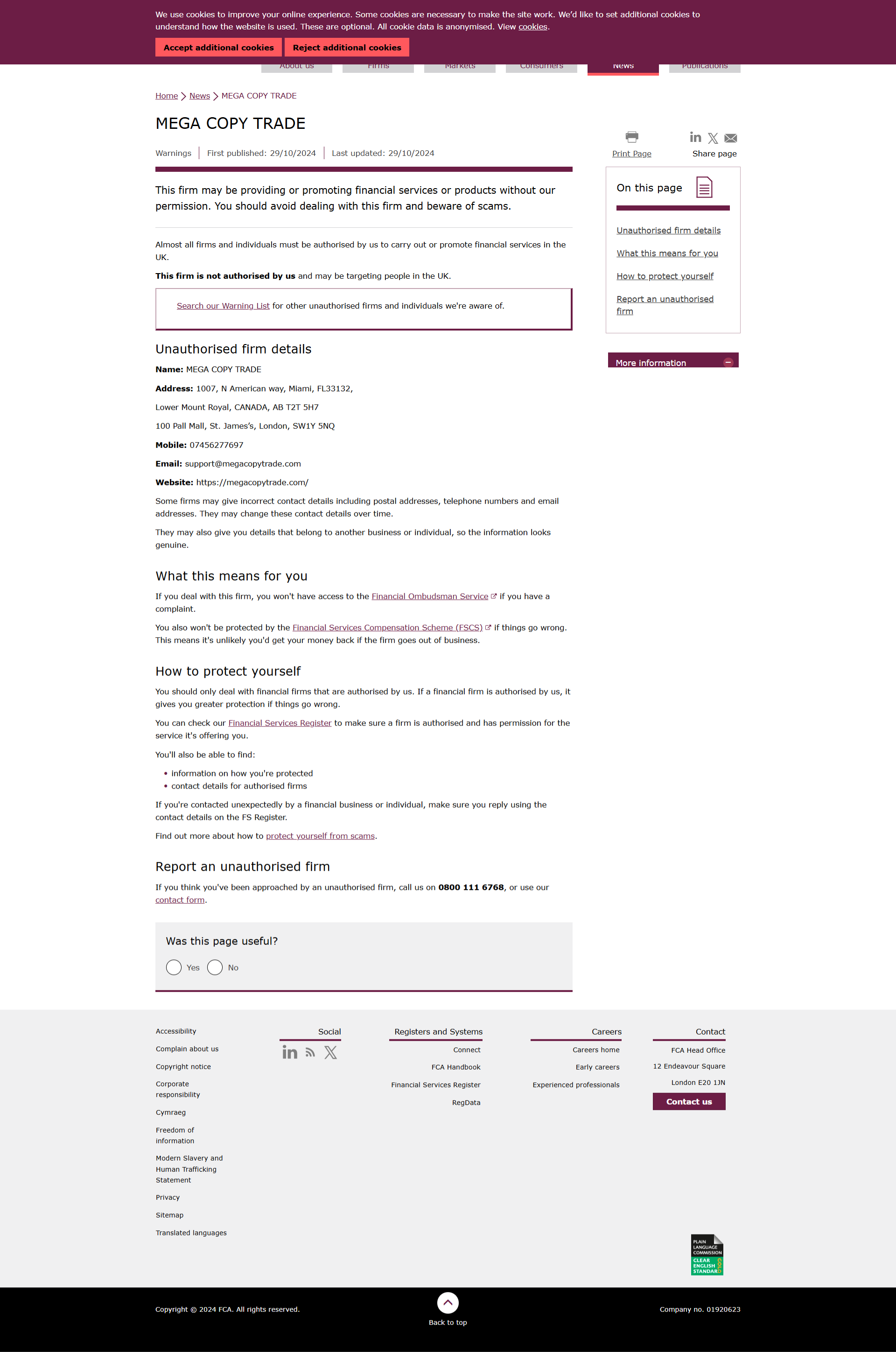Warnings First published: 29/10/2024 Last updated: 29/10/2024 This firm may be providing or promoting financial services or products without our permission. You should avoid dealing with this firm and beware of scams. Almost all firms and individuals must be authorised by us to carry out or promote financial services in the UK. This firm is not authorised by us and may be targeting people in the UK. Search our Warning List for other unauthorised firms and individuals we're aware of. Unauthorised firm details Name: MEGA COPY TRADE Address: 1007, N American way, Miami, FL33132, Lower Mount Royal, CANADA, AB T2T 5H7 100 Pall Mall, St. James’s, London, SW1Y 5NQ Mobile: 07456277697 Email: support@megacopytrade.com Website: https://megacopytrade.com/ Some firms may give incorrect contact details including postal addresses, telephone numbers and email addresses. They may change these contact details over time. They may also give you details that belong to another business or individual, so the information looks genuine.