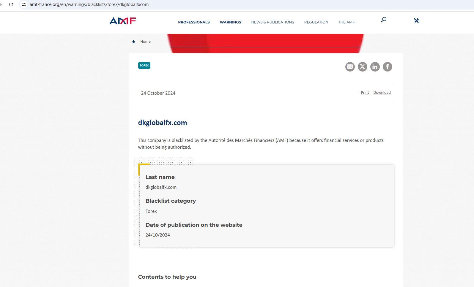 dkglobalfx.com This company is blacklisted by the Autorité des Marchés Financiers (AMF) because it offers financial services or products without being authorized. Last name dkglobalfx.com Blacklist category Forex Date of publication on the website 24/10/2024