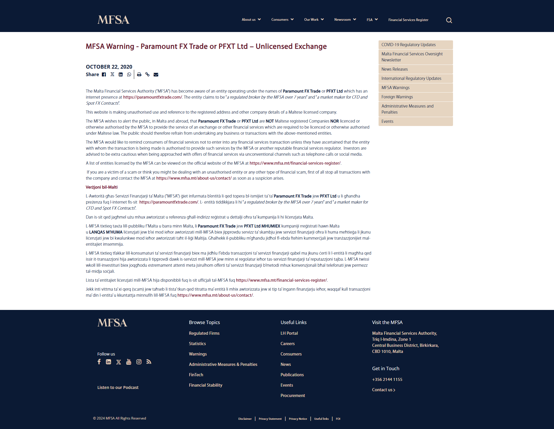 L-MFSA tixtieq tavża lill-pubbliku f’Malta u barra minn Malta, li Paramount FX Trade jew PFXT Ltd MHUMIEX kumpaniji rreġistrati hawn Malta u LANQAS M’HUMA liċenzjati jew b’xi mod ieħor awtorizzati mill-MFSA biex jipprovdu servizz ta’ skambju jew servizzi finanzjarji oħra li huma meħtieġa li jkunu liċenzjati jew bi kwalunkwe mod ieħor awtorizzati taħt il-liġi Maltija. Għalhekk il-pubbliku m’għandu jidħol fl-ebda ftehim kummerċjali jew tranżazzjonijiet mal-entitajiet imsemmija.