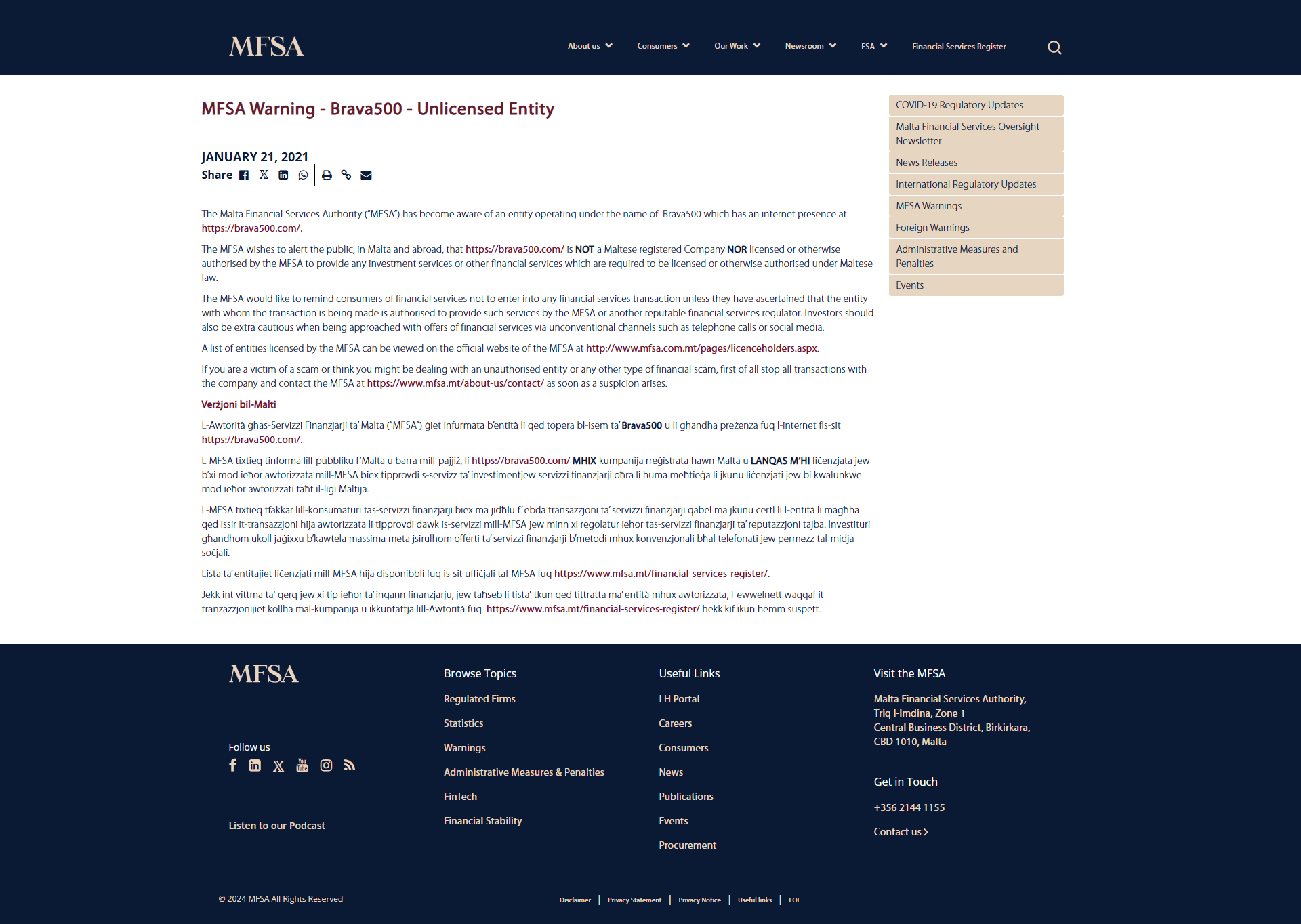 The Malta Financial Services Authority (“MFSA”) has become aware of an entity operating under the name of Brava500 which has an internet presence at https://brava500.com/.