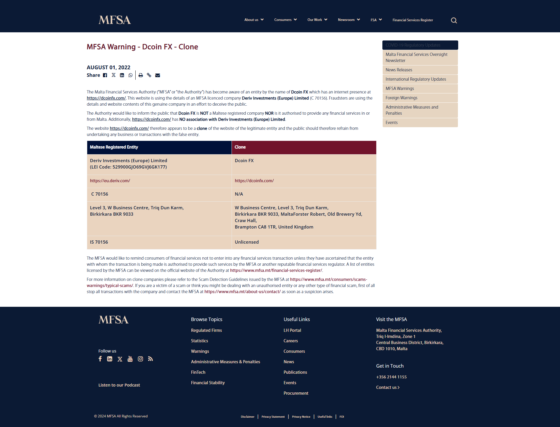 MFSA Warning - Dcoin FX - Clone