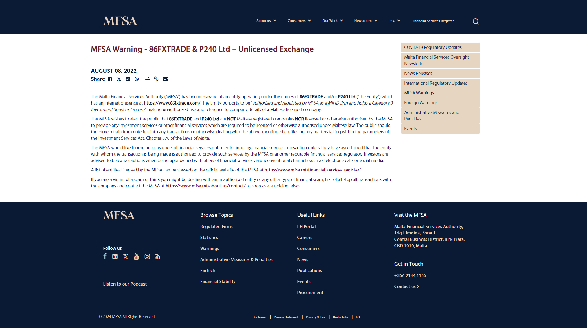 The Malta Financial Services Authority (“MFSA”) has become aware of an entity operating under the names of 86FXTRADE and/or P240 Ltd (“the Entity”) which has an internet presence at https://www.86fxtrade.com/. The Entity purports to be “authorized and regulated by MFSA as a MiFID firm and holds a Category 3 Investment Services License”, making unauthorised use and reference to company details of a Maltese licensed company.