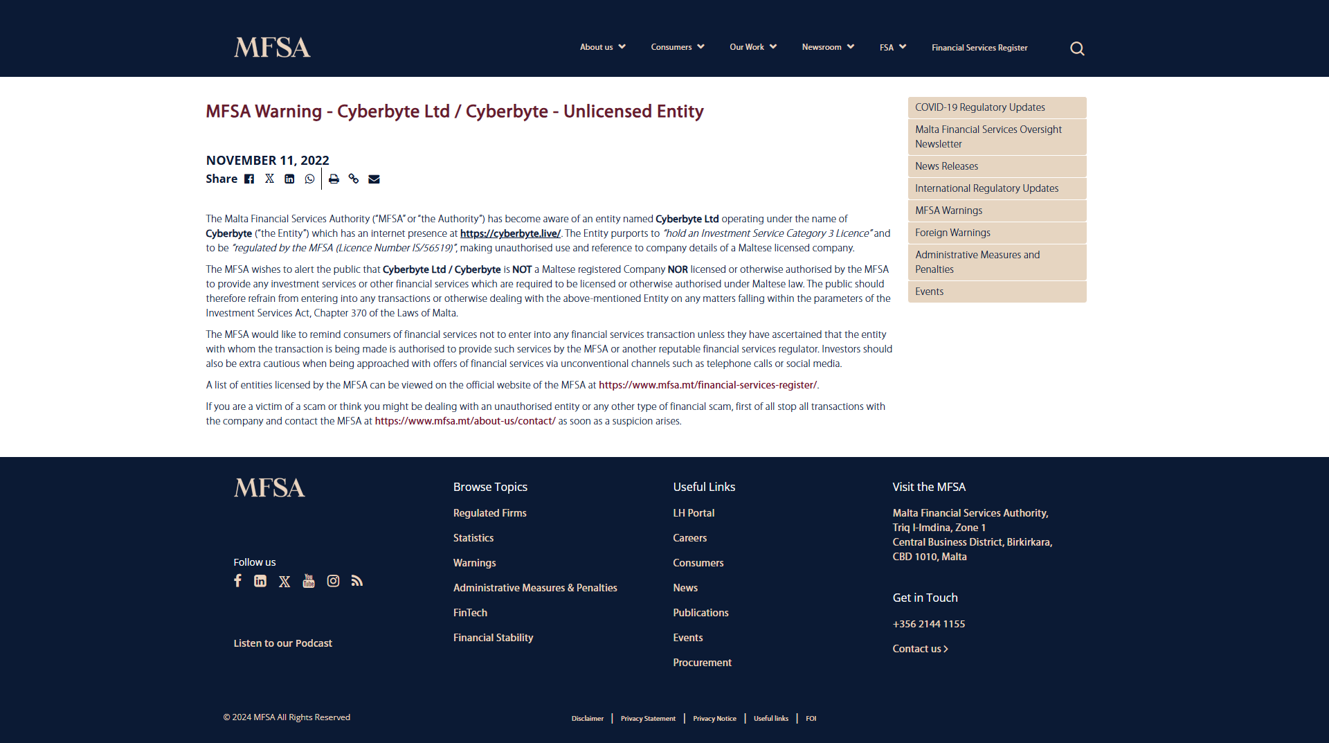 The Malta Financial Services Authority (“MFSA” or “the Authority”) has become aware of an entity named Cyberbyte Ltd operating under the name of Cyberbyte (“the Entity”) which has an internet presence at https://cyberbyte.live/. The Entity purports to “hold an Investment Service Category 3 Licence” and to be “regulated by the MFSA (Licence Number IS/56519)”, making unauthorised use and reference to company details of a Maltese licensed company.