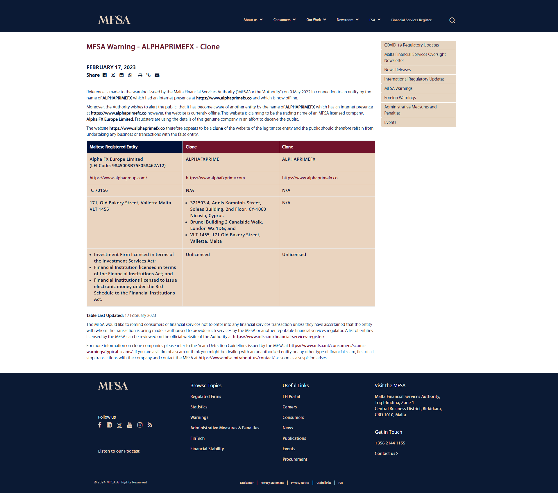 Reference is made to the warning issued by the Malta Financial Services Authority (“MFSA” or the “Authority”) on 9 May 2022 in connection to an entity by the name of ALPHAPRIMEFX which had an internet presence at https://www.alphaprimefx.co and which is now offline.