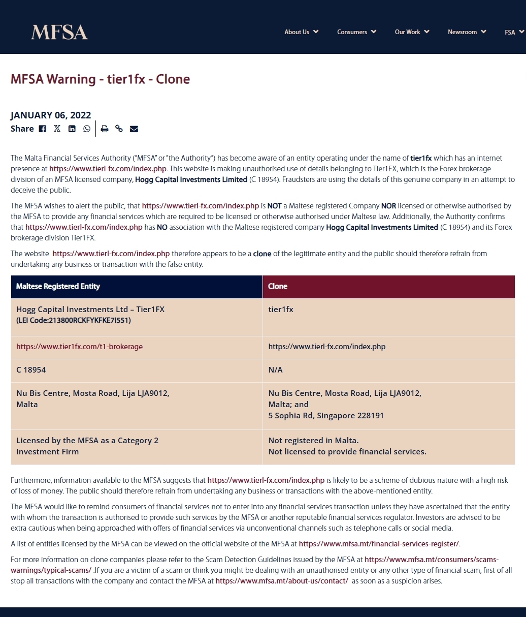 The Malta Financial Services Authority (“MFSA” or “the Authority”) has become aware of an entity operating under the name of tier1fx which has an internet presence at https://www.tierl-fx.com/index.php. This website is making unauthorised use of details belonging to Tier1FX, which is the Forex brokerage division of an MFSA licensed company, Hogg Capital Investments Limited (C 18954). Fraudsters are using the details of this genuine company in an attempt to deceive the public.