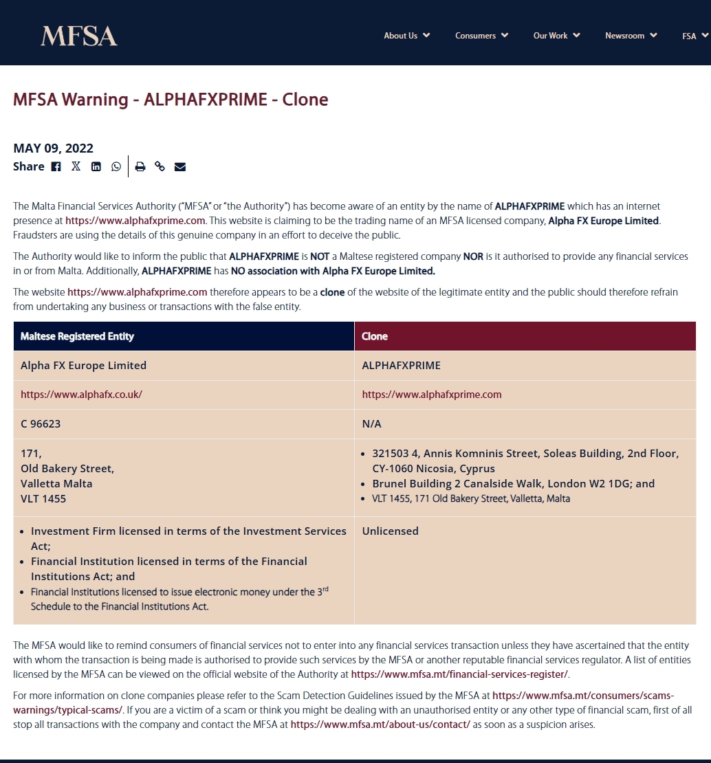 The Malta Financial Services Authority (“MFSA” or “the Authority”) has become aware of an entity by the name of ALPHAFXPRIME which has an internet presence at https://www.alphafxprime.com. This website is claiming to be the trading name of an MFSA licensed company, Alpha FX Europe Limited. Fraudsters are using the details of this genuine company in an effort to deceive the public.