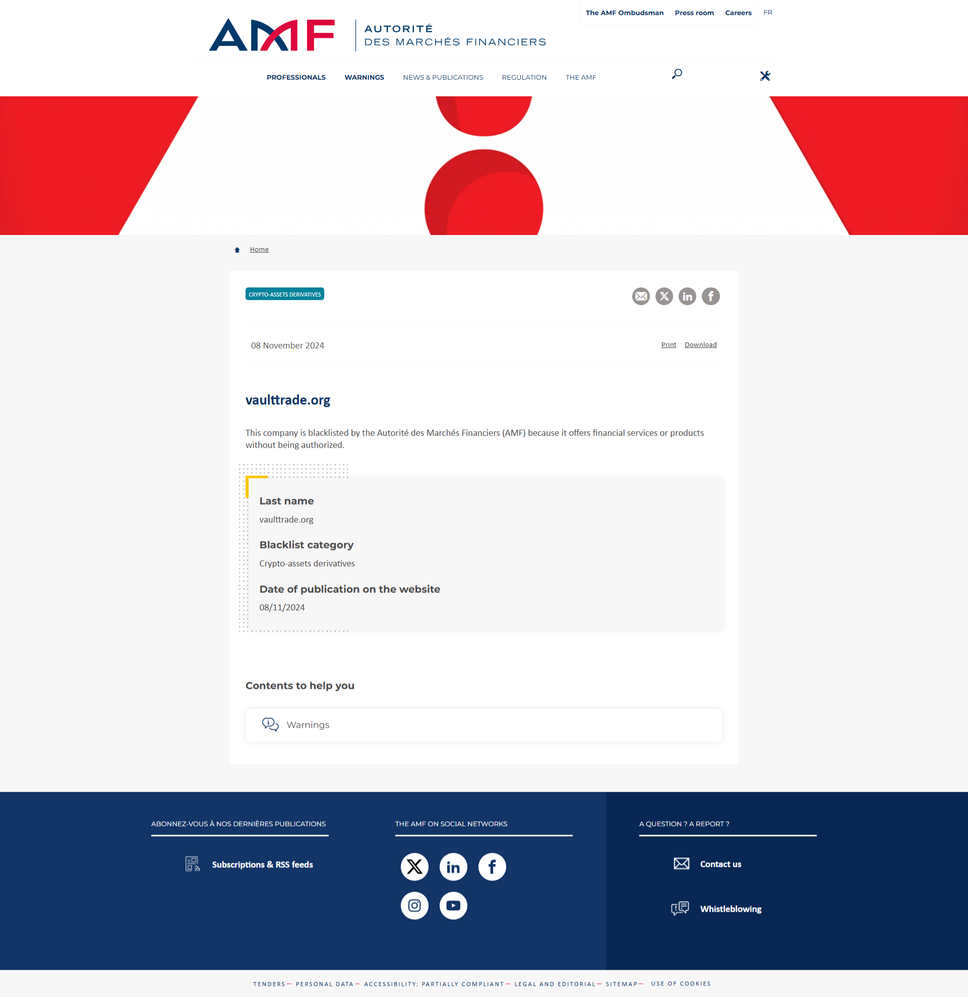 vaulttrade.org This company is blacklisted by the Autorité des Marchés Financiers (AMF) because it offers financial services or products without being authorized. Last name vaulttrade.org Blacklist category Crypto-assets derivatives Date of publication on the website 08/11/2024