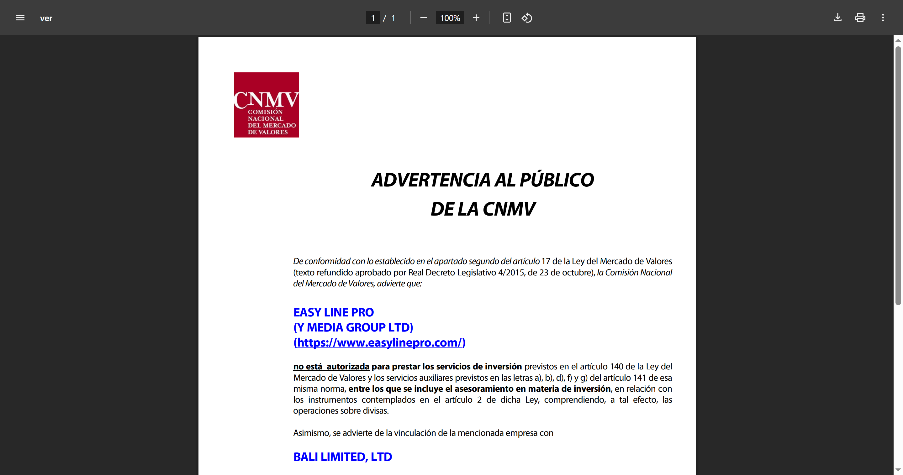 Public notice from the CNMV, in accordance with the provisions of the second section of article 17 of the Securities Market Law (consolidated text approved by Royal Legislative Decree 4/2015, of October 23), the National Securities Market Commission warns that: Easy Line Pro (and media group ltd) (https://www.easylinepro.com/) is not authorized to provide the investment services provided for in article 140 of the securities market law and the ancillary services provided for in letters a), b), d), f) and g) of article 141 of that same law, which includes investment advice, in relation to the instruments contemplated in article 2 of said law, including, for this purpose, foreign exchange transactions. Likewise, it is noted that the aforementioned company is linked to bali limited, ltd, which was the subject of a warning to the public by the CNMV on July 3, 2017. For any queries, please call 900 535 015 or visit the CNMV website (www.cnmv.es) on February 5, 2018.