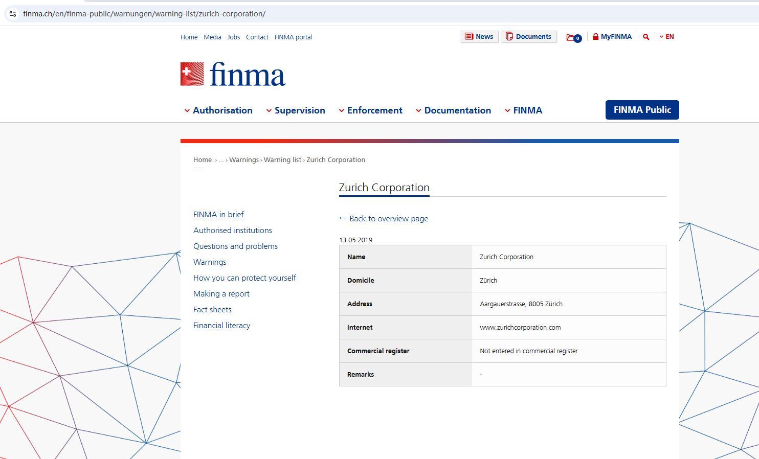 Warning list of unauthorised companies and individuals Zurich Corporation