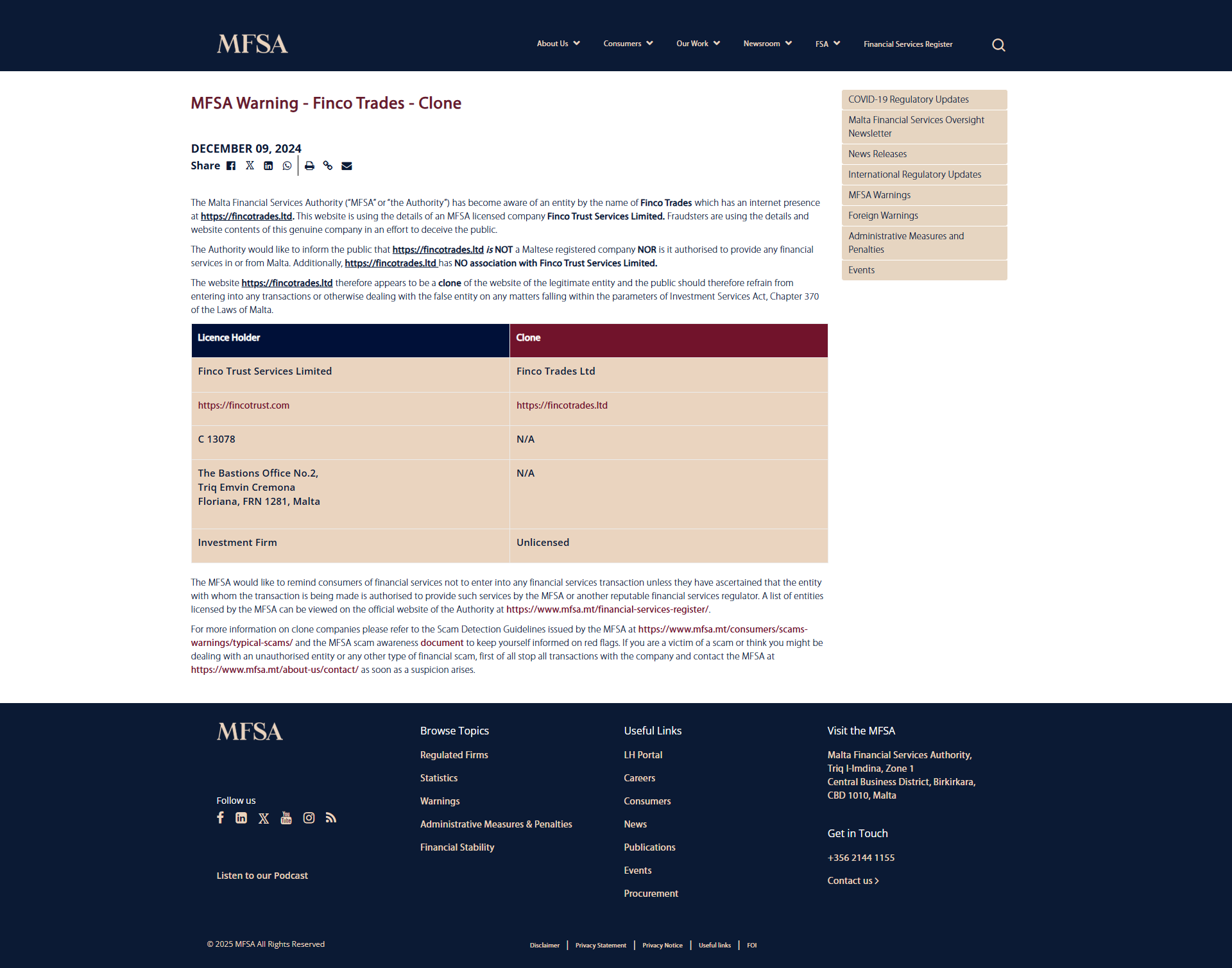 MFSA Warning - Finco Trades - Clone