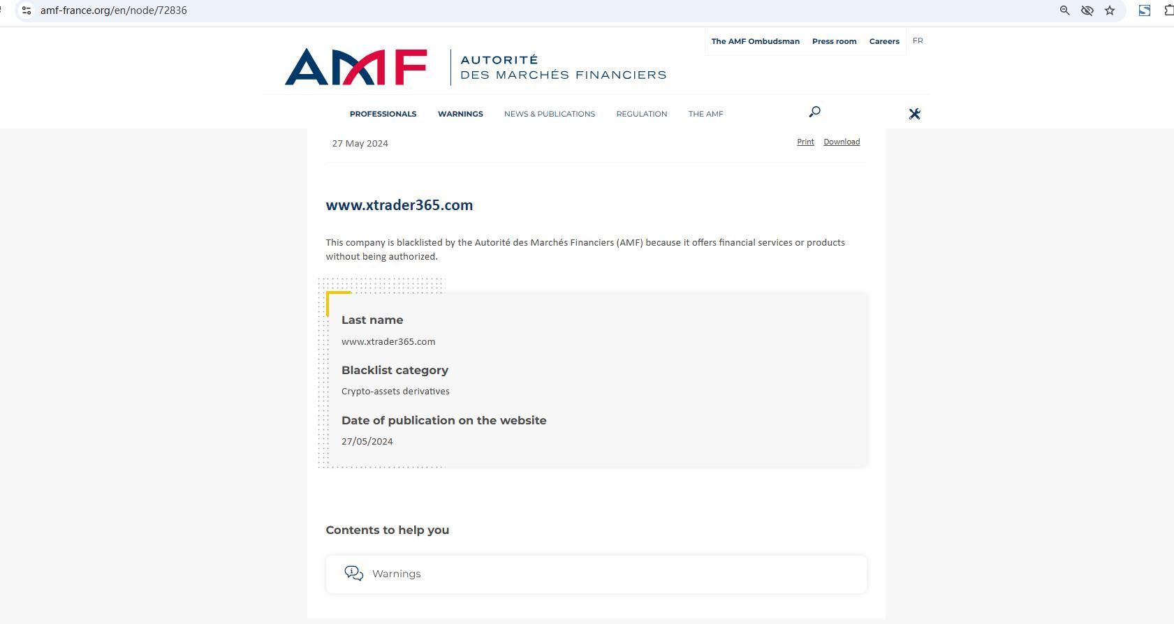www.xtrader365.com This company is blacklisted by the Autorité des Marchés Financiers (AMF) because it offers financial services or products without being authorized. Last name www.xtrader365.com Blacklist category Crypto-assets derivatives Date of publication on the website 27/05/2024